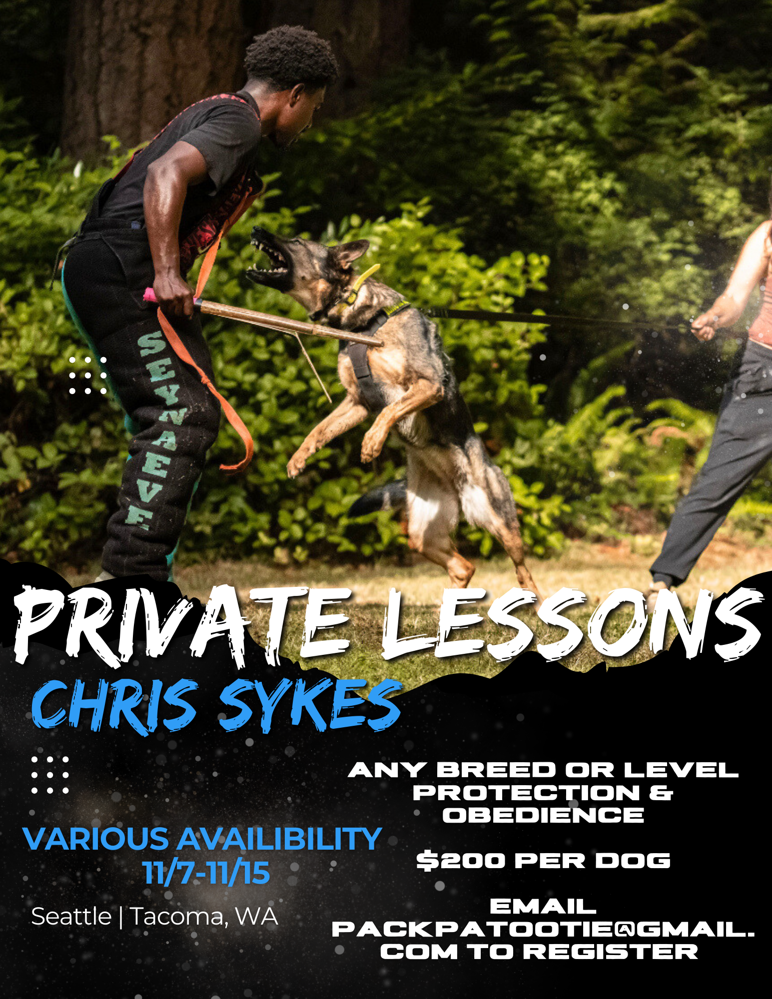 Two Day workshop with Chris Sykes. This will cover play, markers, obedience, protection, and anything else you might be interested in working with your dog!